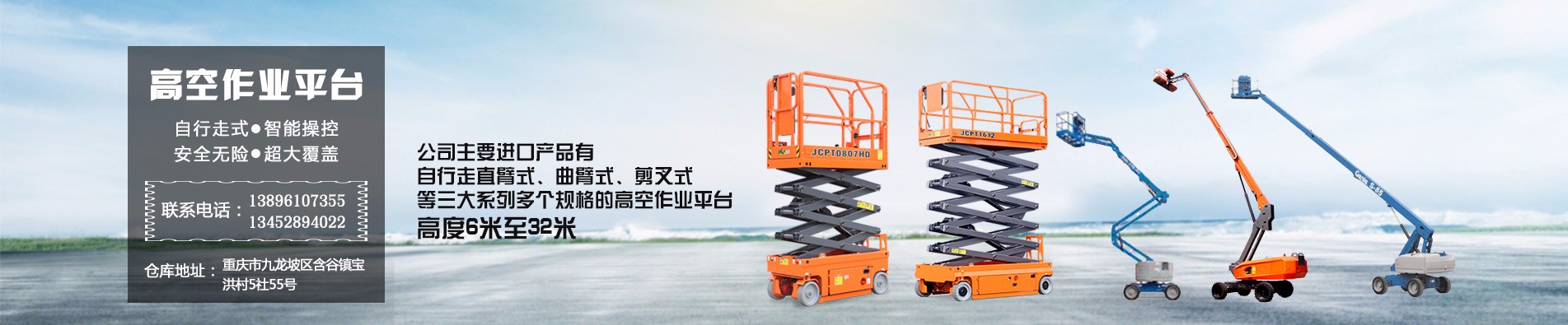 重慶江軒機(jī)械設(shè)備有限公司主要進(jìn)口產(chǎn)品有自行走直臂式、曲臂式、剪叉式等三大系列多個(gè)規(guī)格的高空作業(yè)平臺(tái)。 產(chǎn)品特色是自行走式......